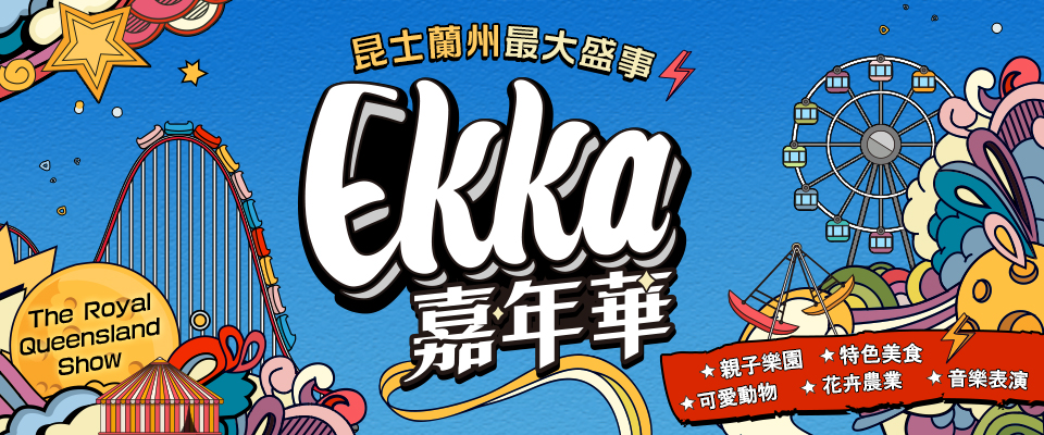 最具澳洲昆士蘭傳統文化代表的節慶今年在2020/8/7~8/16展開,在這裡您可以看到最原汁原味的澳洲農家樂體驗、在地園遊會的歡樂、最吸睛的伐木競技場上蠻力角逐、馬術表演、旋轉木馬等遊樂設施。有時候晚間甚至還有定期的煙火表演,除此之外EKKA也很像是一個大型的園遊會,特色美食眾多如新鮮乳酪、香腸、火雞腿、冰淇淋...等。EKKA具有豐富的傳統文化,獨特的氛圍,是一代又一代昆士蘭人的集體回憶,也是最地道的昆士蘭風情,是你絕不能錯過的文化體驗 !